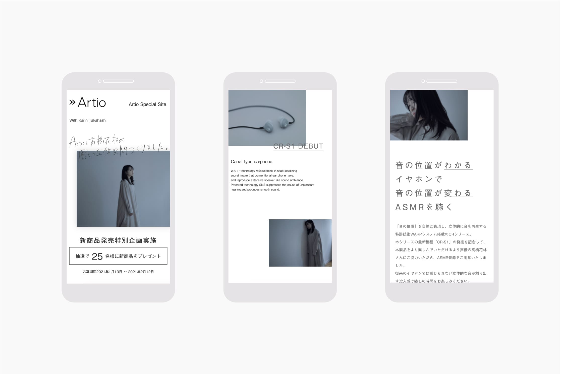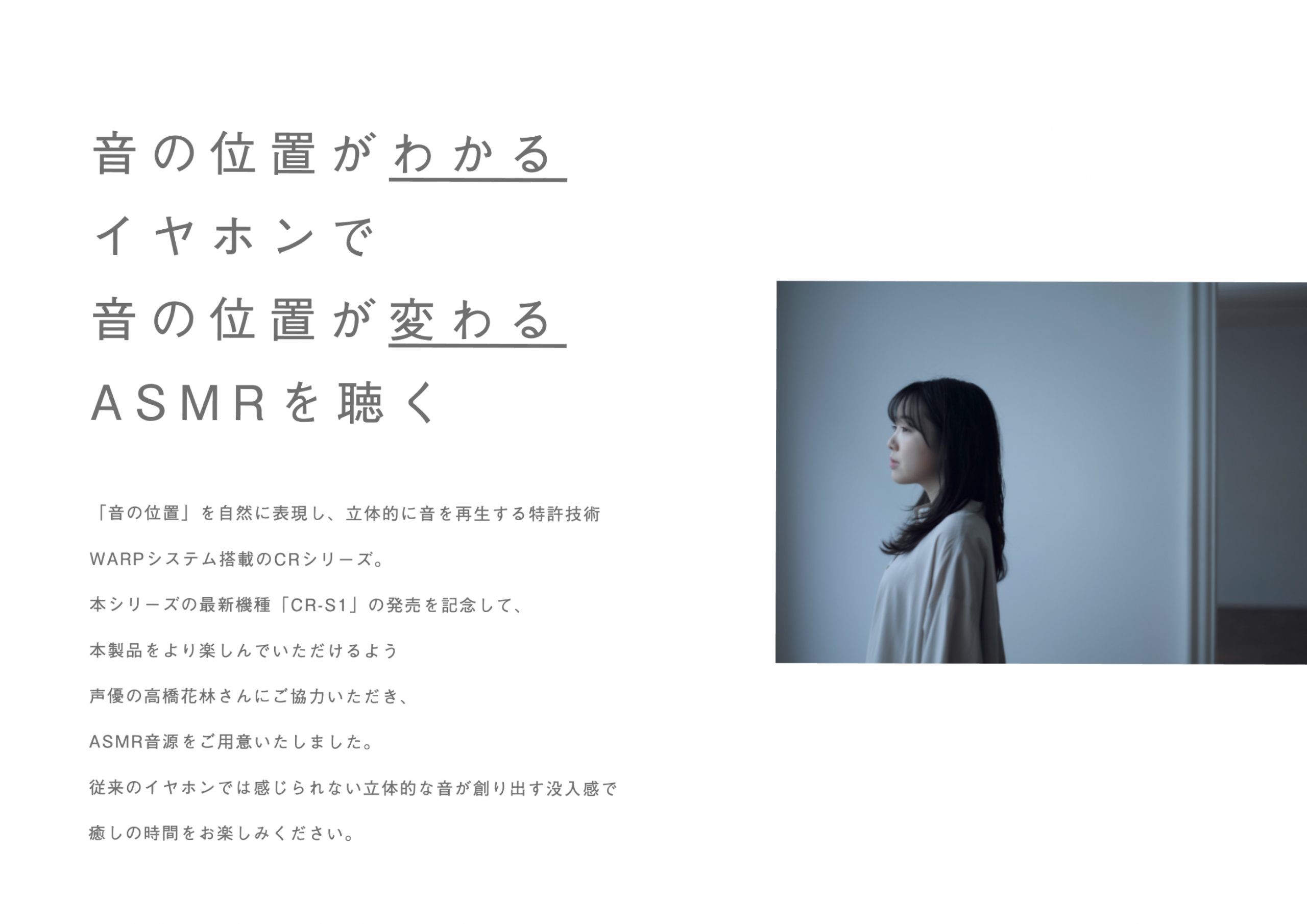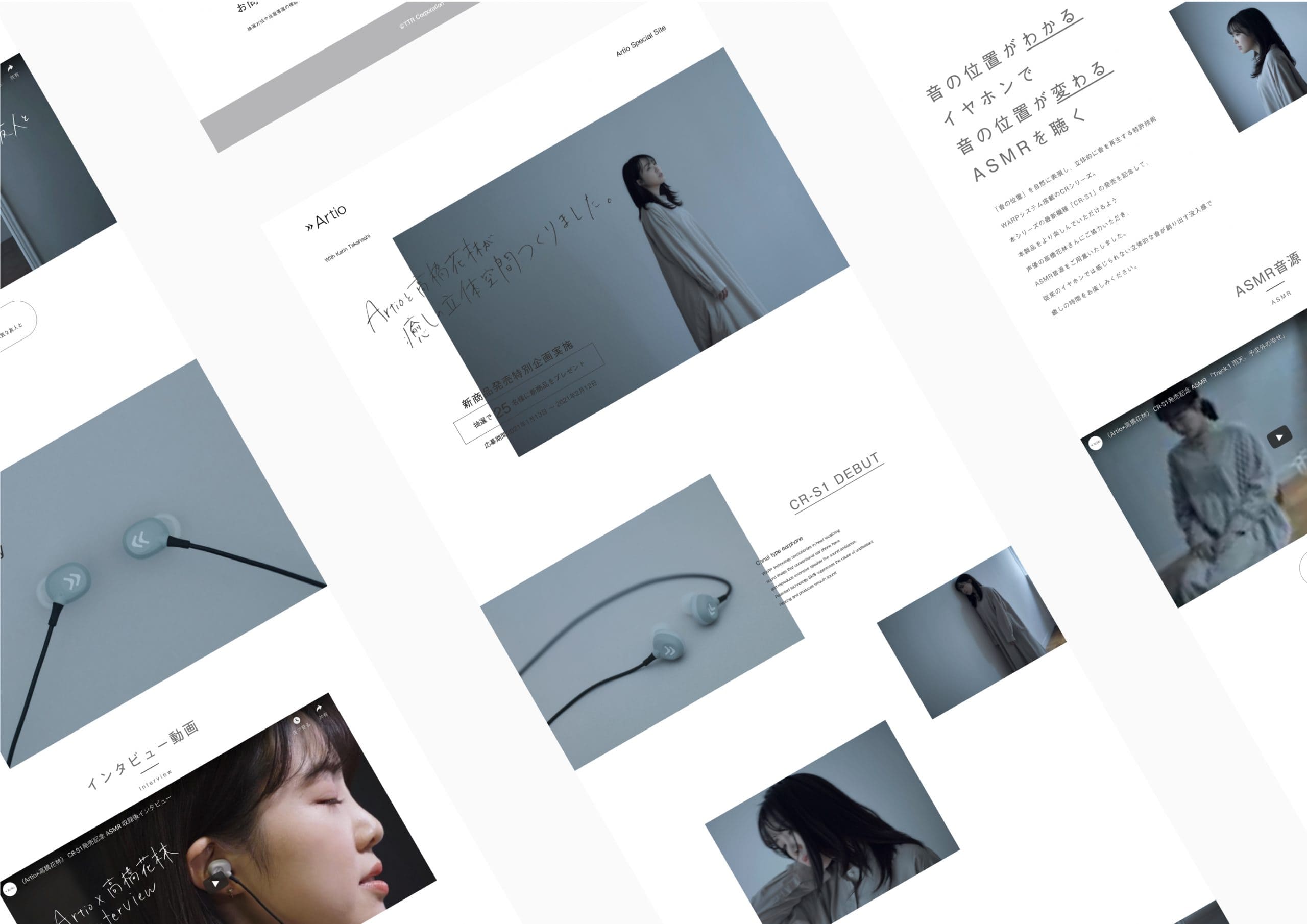 イヤフォンのメーカー、アルティオ様のキャンペーンサイトを作成しました。声優の高橋花林さんと新製品のイヤフォンCR-S1とのコラボレーションです。コーポレートサイトのデザインイメージにわせて作成しました。デザインと実装を担当しています。